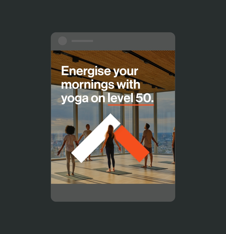 The Next Level logo, inspired by the 8 Bishopsgate logo, stays in line with the main brand while also symbolizing progress and aspiration. Placed in the top right corner, it represents forward-thinking and a drive for advancement. To encompass all facets of the brand, additional brand assets were created for use across all ‘Next Level’ marketing materials.